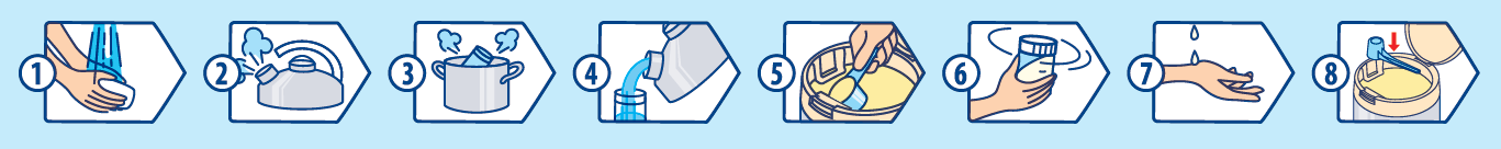 - Vāriet dzeramo ūdeni 5 minūtes. Atdzesējiet vārīto ūdeni līdz 40°C (remdens) pirms maisījuma pagatavošanas.