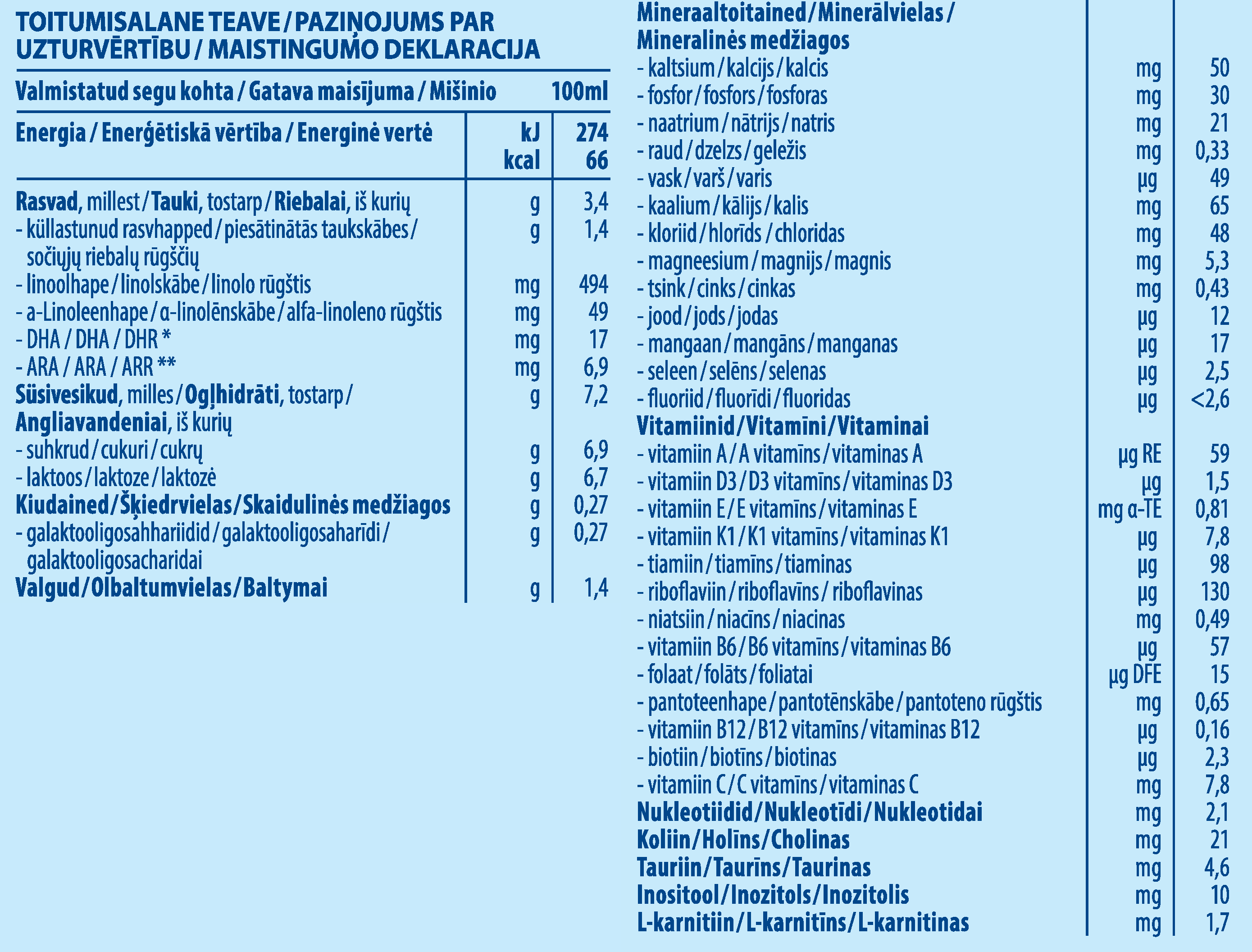 Satur DHA – kā paredzēts tiesību aktos attiecībā uz visiem maisījumiem zīdaiņiem.